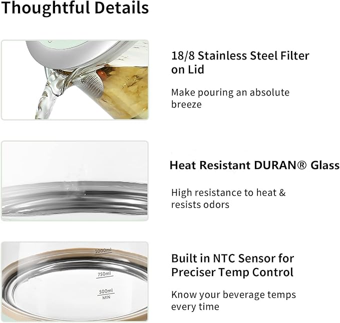 - Superior Material: Heat resistant DURAN Glass and 316L stainless steel heating plate, BPA Free's K2763 is safe in every bite. Strix thermostat makes kettle temperature more accurate and longer lasting