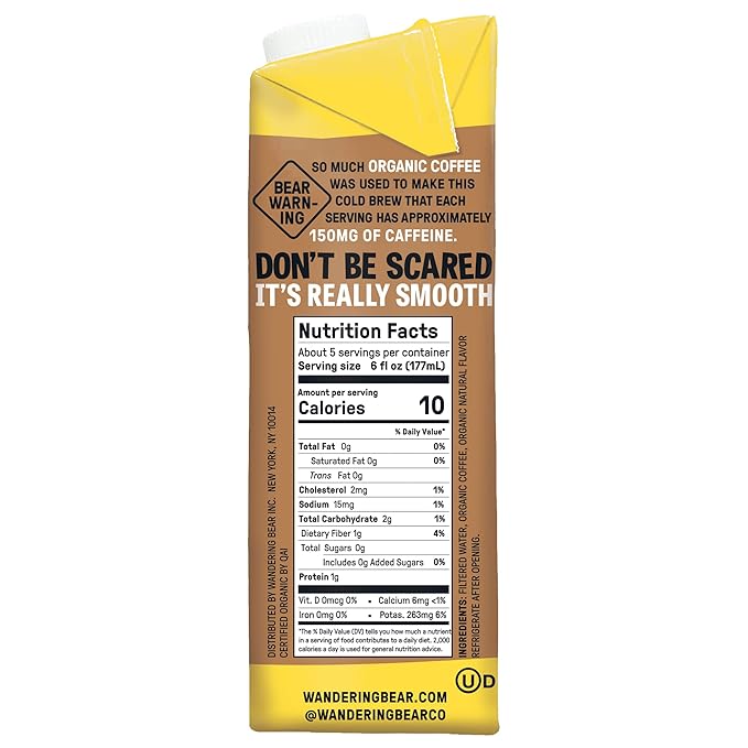 Wandering Bear Organic Caramel Cold Brew Coffee, 32 fl oz, 6 pack - Extra Strong, Bold, Smooth, Unsweetened, Shelf-Stable, Ready to Drink, Gluten Free, & Vegan, Iced Cold Brewed Coffee Drinks