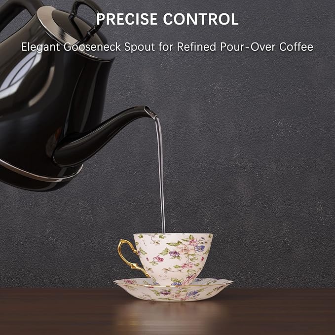 - FOOD-GRADE STAINLESS STEEL FOR PURE WATER – The electric kettle is constructed in 304 stainless steel body with gooseneck spout, and BPA-free plastic handle and steam lid. Food-grade stainless steel tea kettle gives you a great lifespan, remarkable durability, and perfect insulation, as well as the purest water without chemical hazard.