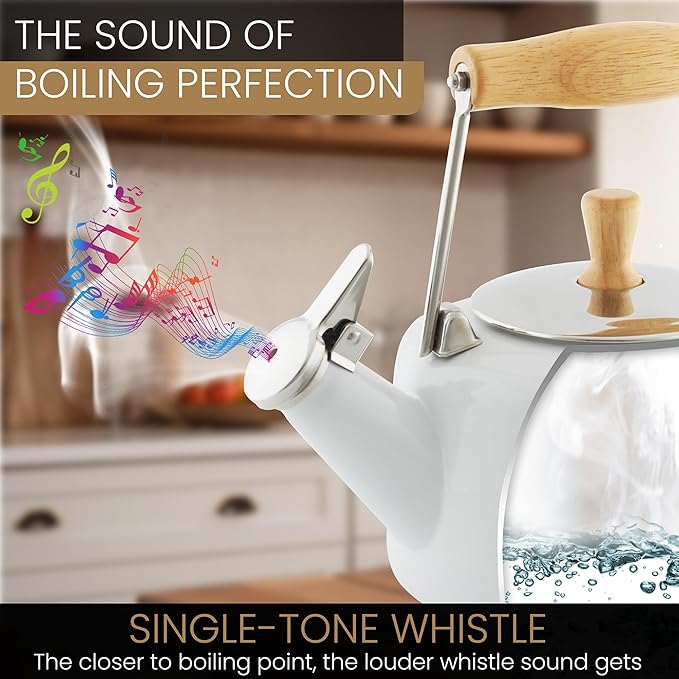 - JOYFUL WHISTLE, PERFECT TIMING: Never miss the boiling point again with our kettle's charming whistle that signals when your water is ready. The whistle at the tip of the spout emits a clear, pleasant sound, adding a touch of joy to your kitchen.