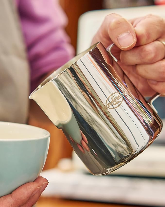 - Milk Frothing Pitcher 32 Oz: Crafted with 18/8 stainless steel, our coffee art tool features triple-layer rust-resistant construction that withstands daily espresso machine use. The food-safe mirror finish meets commercial coffee standards while elevating your home barista setup. Thickened base prevents warping even at 160°F+ steaming temperatures