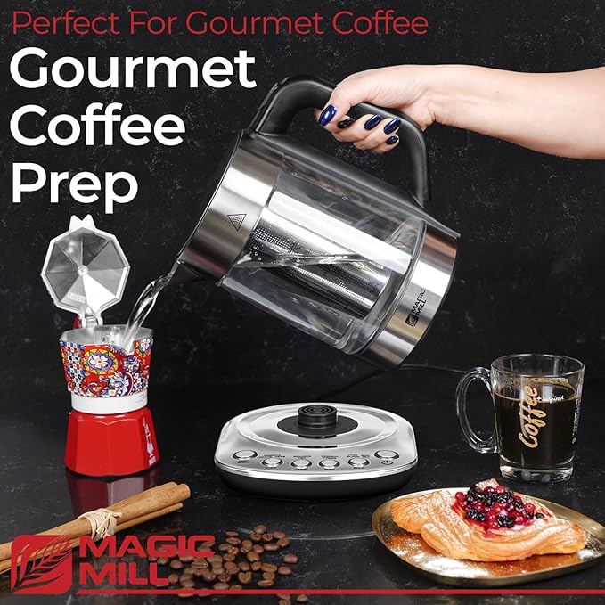 - BESPOKE BREWING AT YOUR FINGERTIPS: Discover the joy of a perfect cup of tea or coffee with Magic Mill's electric tea kettle with temperature control. Choose from pre-programmed settings for white, green, oolong, and black teas, and enjoy your favorite beverages brewed to perfection every single time.