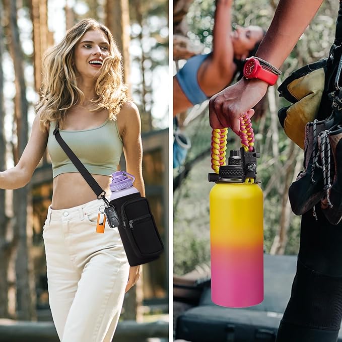 - HANDS-FREE BOTTLE CARRIER BAG & PROTECTIVE BOOT - 32oz stainless steel water bottle with hands-free shoulder carrier bag that features 2 zipper storage pockets to hold your phone, cards, and keys, and the shoulder carrier pouch also provides extra insulation. The protective silicone boot full-protects the reusable water bottle from additional damage and extends the life of thermo water flask bottle