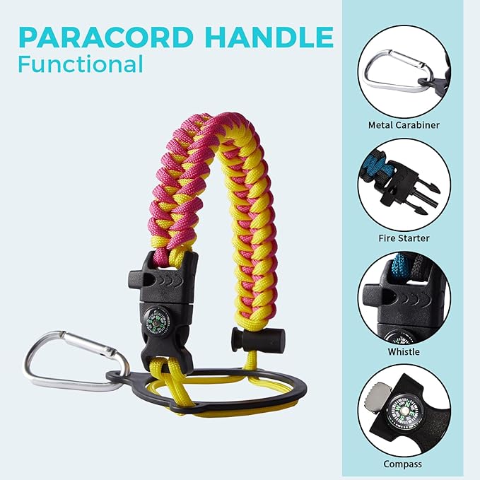 - PERSONALIZATION BOTTLE PARACORD HANDLE - Quarter gallon water bottle with a pretty cool functional paracord handle which does more than meets the eye.?The survival strap cord is made of military-grade nylon and comes with a compass, safety loop, metal carabiner, flint, igniter, and whistle, making it a functional and stylish addition to your thermo water flask, is perfect for outdoor camping, hiking, fitness enthusiasts