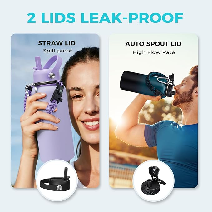 - LEAK-PROOF 2 LIDS - AUTO SPOUT LID & STRAW LID allow you enjoy spill-proof sipping and fast drinking to meet your different drinking needs. The pop-up spout lid is designed for one-hand open and close, with a large water outlet for fast drinking. The spill-proof straw lid makes you easy sip on the go, great to all your outdoor adventures, and also prevent the inhalation of ice cubes