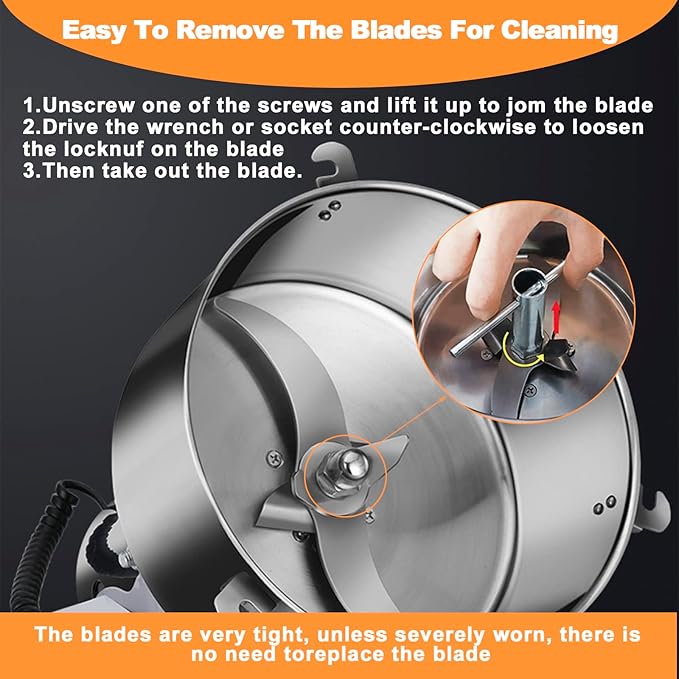- 304 Stainless steel Food Grade Material:The grinder be made of food-grade stainless steel, sturdy and durable.Triples blade: grinding blade, rotary blade, and powder removal blade, can be pulverized easily.the metal motor blade is wear resistance good.