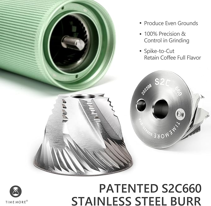 - S2C Patent Conical Burr: The TIMEMORE Manual Coffee Grinder is equipped with the revolutionary S2C patent conical burr. This advanced burr design ensures a consistent and even grind size, allowing for the perfect extraction of flavor from every bean. With its precision-engineered shape and cutting-edge material, the S2C burr provides exceptional grind uniformity and minimal heat generation during grinding, ensuring maximum flavor retention in every cup.