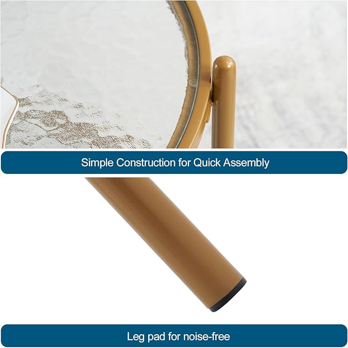 - 【Unique Water-wave Texture】The water-wave texture glass top and metal frame give this coffee table an elegant and modern look that will complement any decor style. The glass top's texture adds a subtle touch of sophistication and prevents fingerprints or smudges from showing up, making it easy to maintain. The circular shape of the metal frame gives the table a unique and eye-catching silhouette.
