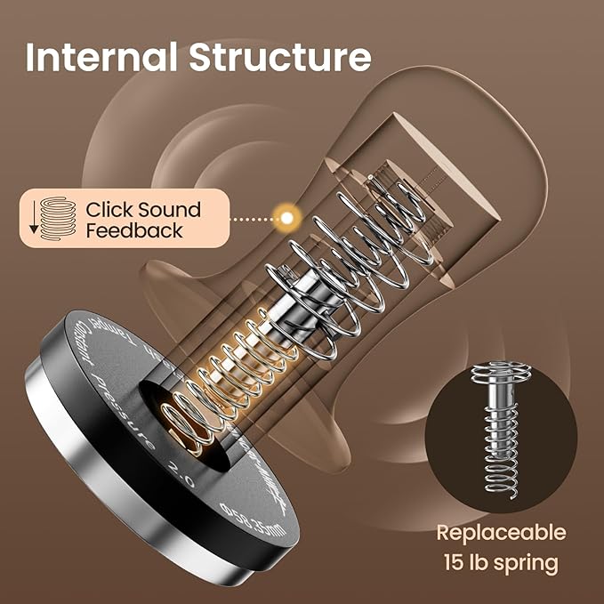 - Tamper With Three Springs: The espresso tamper 58mm uses an original three-spring design, which not only maintains a constant pressure of 30lbs, but also provides sound feedback.