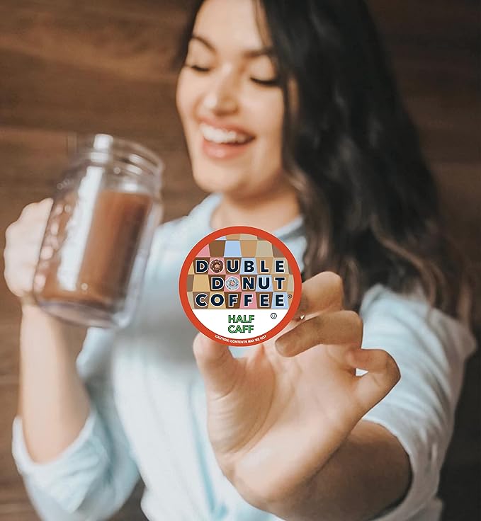 - GREAT VALUE WITH QUALITY INGREDIENTS: Double Donut coffee pods half caffeine blend is vegan, Kosher, Pareve, and keto friendly! Our half caf coffee pods for Keurig machines are made with 100% Arabica Beans. Enjoy hot or as a refreshing iced coffee.