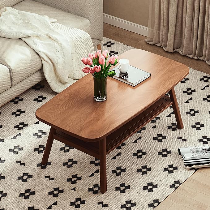 2-Tier Solid Oak Wood Coffee Table - Practical Center Table with Double Storage for Small Apartments, Living Rooms, Bedrooms, and Offices (Walnut, 31.49" D x 19.68" W x 17.32" H)