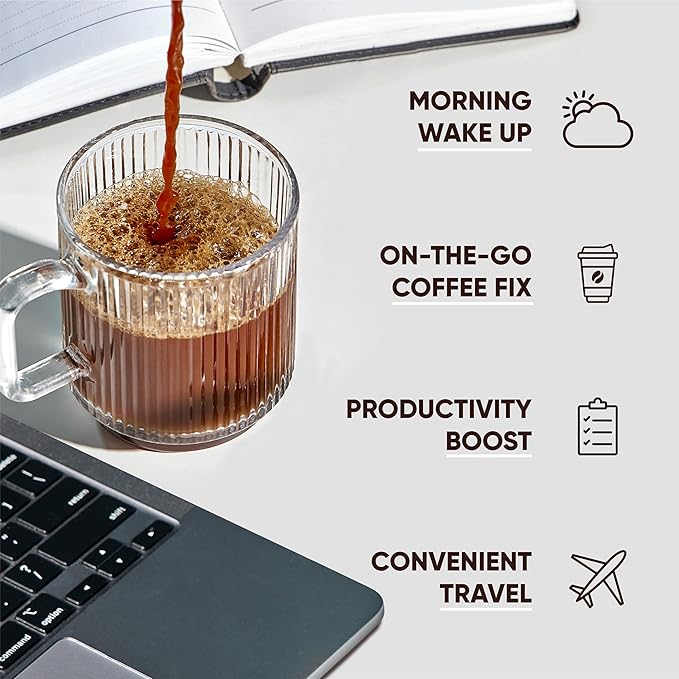 - DELICIOUS COFFEE FLAVORS ANYWHERE: Enjoy Toasted Hazelnut, Caffè Mocha, Vanilla Spice, and Original Black in convenient single-serve packets. Just mix with 8–12oz hot water for smooth, clean energy. Perfect for home, office, travel, or camping
