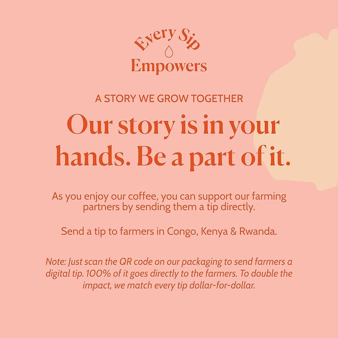 - ๐๐ผ๐ณ๐ณ๐ฒ๐ฒ ๐ฌ๐ผ๐ ๐๐ฎ๐ป ๐๐ฒ๐ฒ๐น ๐๐ผ๐ผ๐ฑ ๐๐ฏ๐ผ๐๐: As you enjoy our coffee, you can support our farming partners by sending them a tip directly. Just scan the QR code on our packaging to send them a digital tip. 100% of it goes directly to the farmers, and to double the impact, we match every tip dollar-for-dollar.