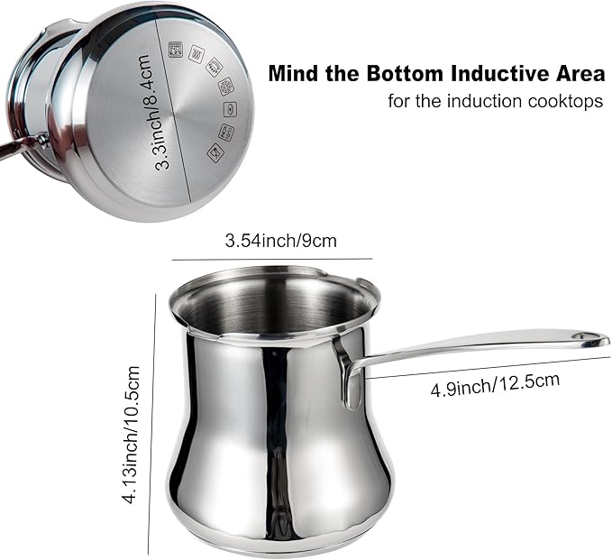 - Compatibility Notice: This Turkish coffee pot has a bottom diameter of 8.4cm (3.3"). Some induction cooktops may not detect it due to size limits. Please check your cooktop’s minimum size requirement before purchase.