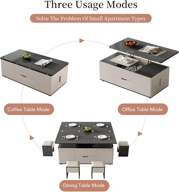 Lift Top Coffee Table with 4 Stools, 3 in 1 Multi-Function Center Table, Modern Lift Tabletop Coffee Table, Extendable Dining Table for Living Room (47.24 Inch)