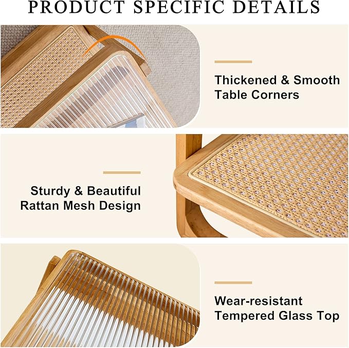 - 【PE Rattan Storage Shelf】Beneath the glass top lies a second layer, a PE rattan woven shelf that provides additional storage and display space. This natural-looking and durable PE rattan weave adds a charming texture to this living room center table. Compared with natural rattan, PE rattan is easier to maintain and clean, has a longer service life.