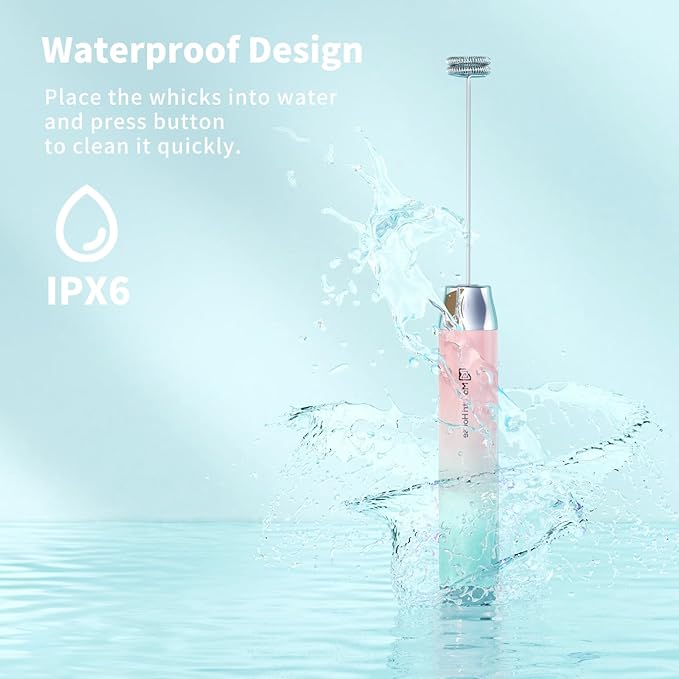 - One-button Operated Design: One press to start the whisking and another press to stop frothing. Just place the LunaFro handheld milk frother’s whisk into the container with milk or other liquid food, then press the button to make milk foam, and press the button again to stop working. It’s effortless to clean. Only put the mixing head into water or soapy water, and then press the button to let eddy water current clean it completely.