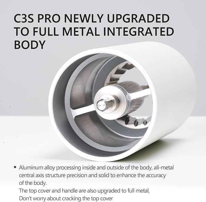 - [ C3 Pro Upgraded to C3S Pro Full Metal Aluminum Body ] Crafted with an all-metal aluminum alloy body, the TIMEMORE C3S Pro manual coffee grinder offers outstanding durability and longevity. This sturdy construction not only withstands frequent use but also protects the internal components from any potential damage. Additionally, the aluminum alloy body contributes to efficient heat dissipation during grinding sessions, preventing overheating that can compromise the delicate flavors of your coffee beans