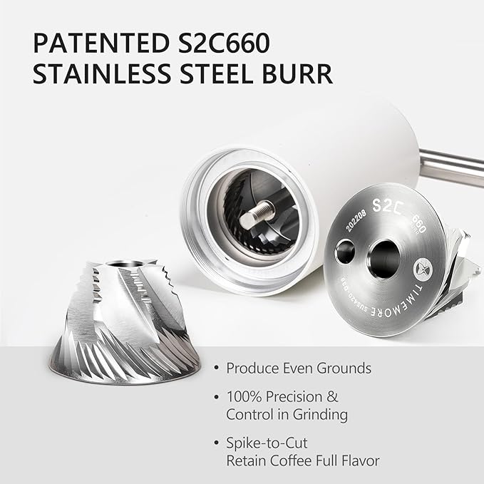 - [ S2C Patent Hexagonal Conical Grinding Burr ] The TIMEMORE Manual Coffee Grinder is equipped with the revolutionary S2C660 patent conical burr. Hand Coffee Grinder Milling blade with 55-58HRC hardness in 5-axis CNC machining realizes uniform grinding with almost no excessively coarse grains. At the same time, the generation of fine powder is minimized. This advanced burr design ensures a consistent and even grind size, allowing for the perfect extraction of flavor from every bean