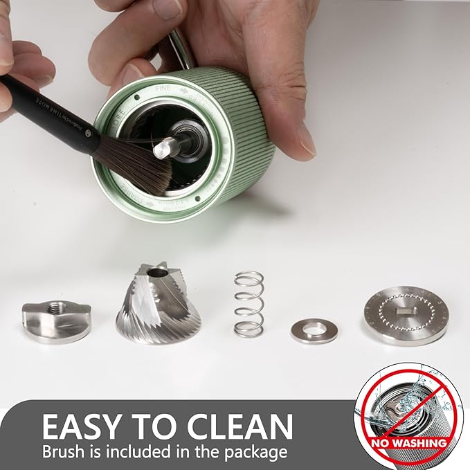 - [ Easy Clean & Carry ] Coffee grinder upgraded folding handle is perfect for on-the-go carrying, while maintaining a lightweight and a moderate sense of weight and luxury. It is ideal not only for home use but also for carrying outdoors or traveling. Easy to disassemble for cleaning - just be cleaned by brush.