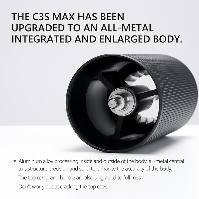 - [ C3 Max Pro Upgraded to C3S Max Full Metal Aluminum Body ] Crafted with an all-metal aluminum alloy body, the TIMEMORE C3S Max manual coffee grinder offers outstanding durability and longevity. This sturdy construction not only withstands frequent use but also protects the internal components from any potential damage. Additionally, the aluminum alloy body contributes to efficient heat dissipation during grinding sessions, preventing overheating that can compromise the delicate flavors of your coffee beans