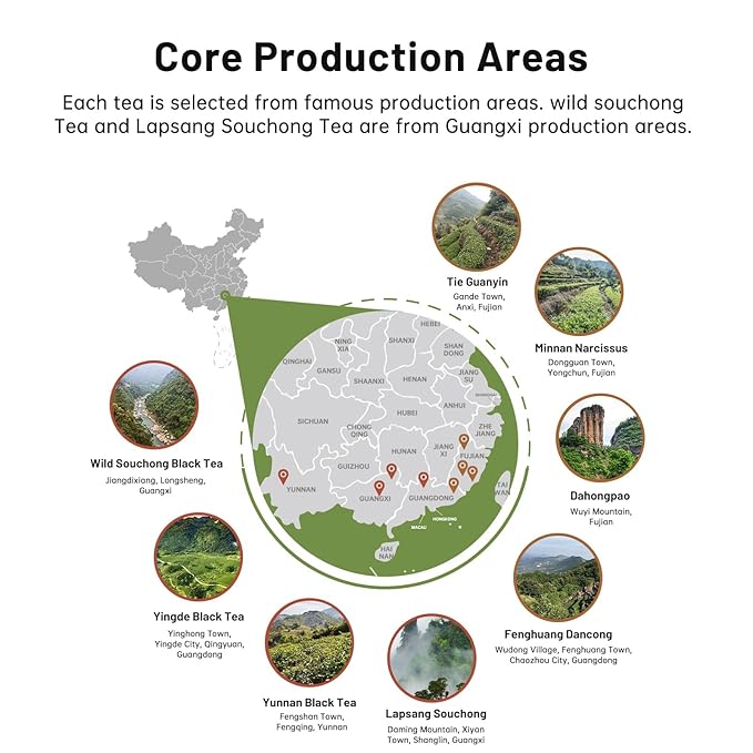 - Authentic core origin: Every tea we choose comes from the core origin of China. Tieguanyin from Anxi, Fujian, Dahongpao is selected from Wuyi Mountain, Fujian, Minnan Narcissus from Dongguan Town, Yongchun County, Fujian, and Fenghuang Dancong from Fenghuang Town, Chaozhou, Guangdong. Yunnan black tea comes from the old tea factory in Fengshan Town, Fengqing County, Yunnan in 1955, Yingde black tea comes from Yinghong Town, Yingde City, Qingyuan, Guangdong, wild small species black tea comes from Jiangdi Township, Longsheng, Guangxi, and Lapsang Souchong comes from Daming Mountain, Xiyan Town, Shanglin County, Guangxi.