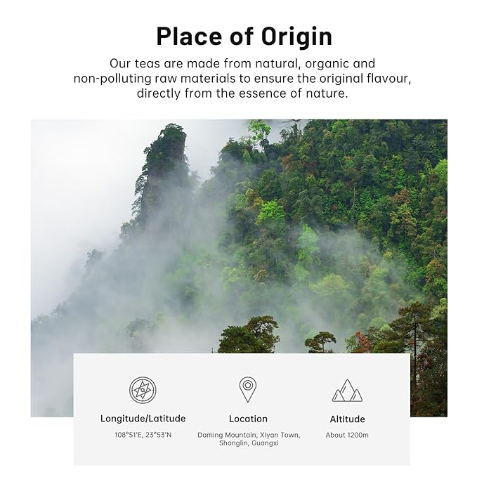 - 【Tea plantation】:From an organic loose leaf tea garden at an altitude of 1200 meters in Shanglin, Guangxi, naturally untouched, preserving the original tea fragrance.