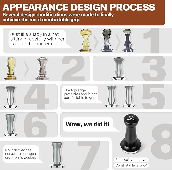 - 【Ergonomic Design for More Comfortable Grip】Several design modifications were made to achieve the most comfortable grip. MEION espresso tamper is the perfect espresso accessories tool for both aspiring home baristas and busy cafes