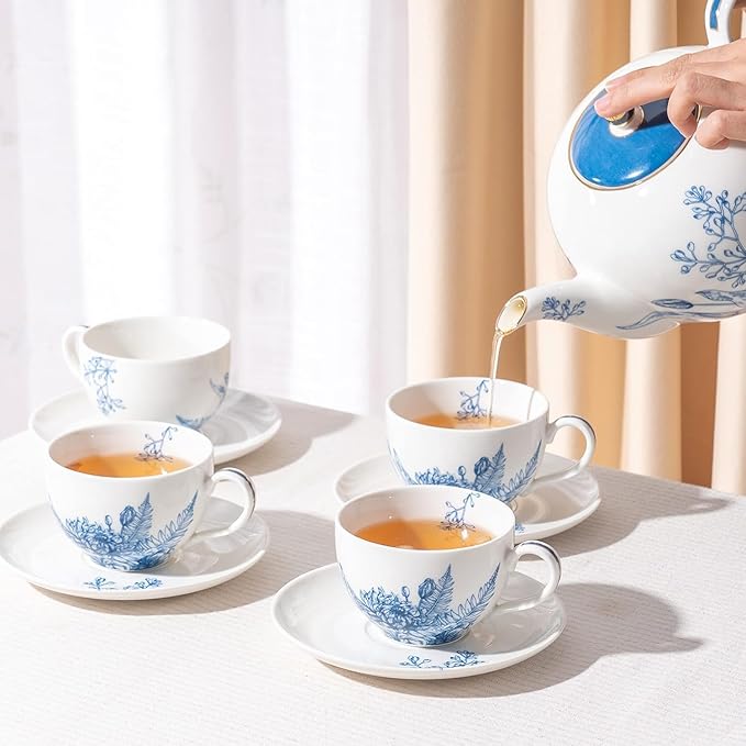 - Generous Capacity : These tea sets Comprise a 37 oz teapot, 4 pcs 6 oz teacups and 4 saucers. The European teapot can effortlessly refill one teacup up to 6 times, making it perfect for sharing delightful moments with friends and family