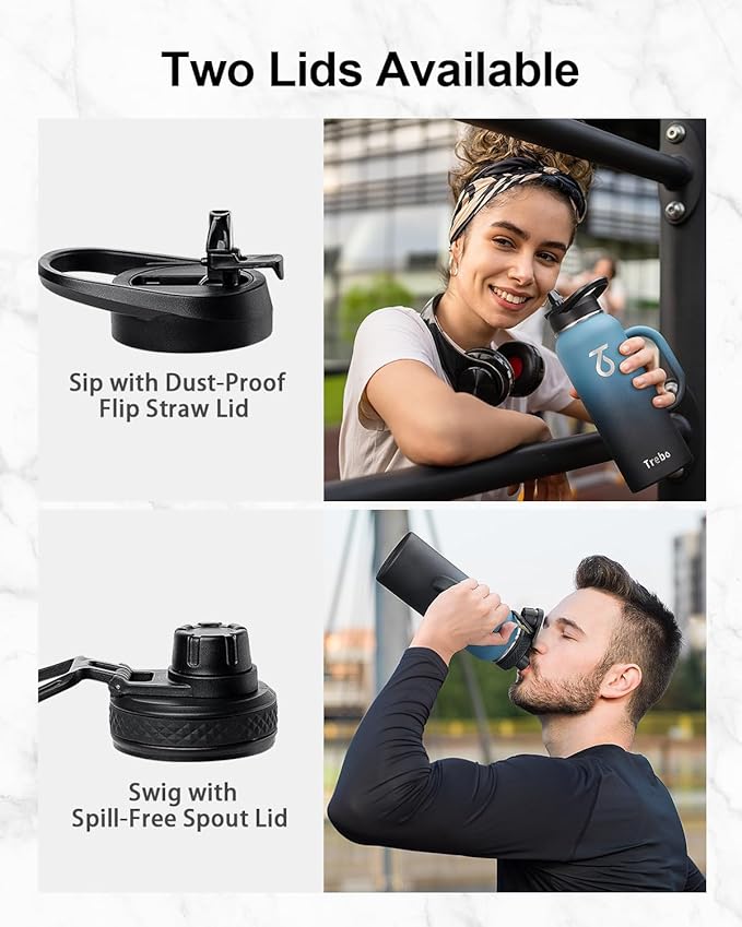 - 100% Leak-proof: Trebo 40oz stainless steel water bottle comes with a dust-proof flip straw lid and a spill-free spout lid, meeting your different needs. And each lid with accurate silicone seal rings, they are both 100% leak-proof and spill-proof.