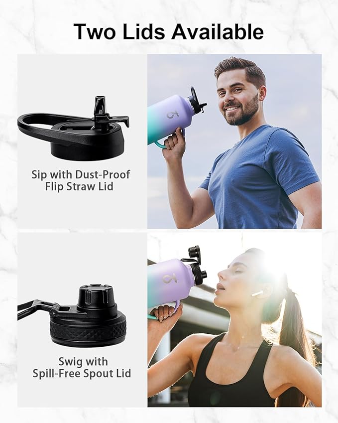 - No Spills, No Worries: Our stainless steel water bottle comes with a dust-proof flip straw lid and a spill-free spout lid, meeting your different needs. With accurate silicone seal rings, they are both 100% leak-proof and spill-proof.