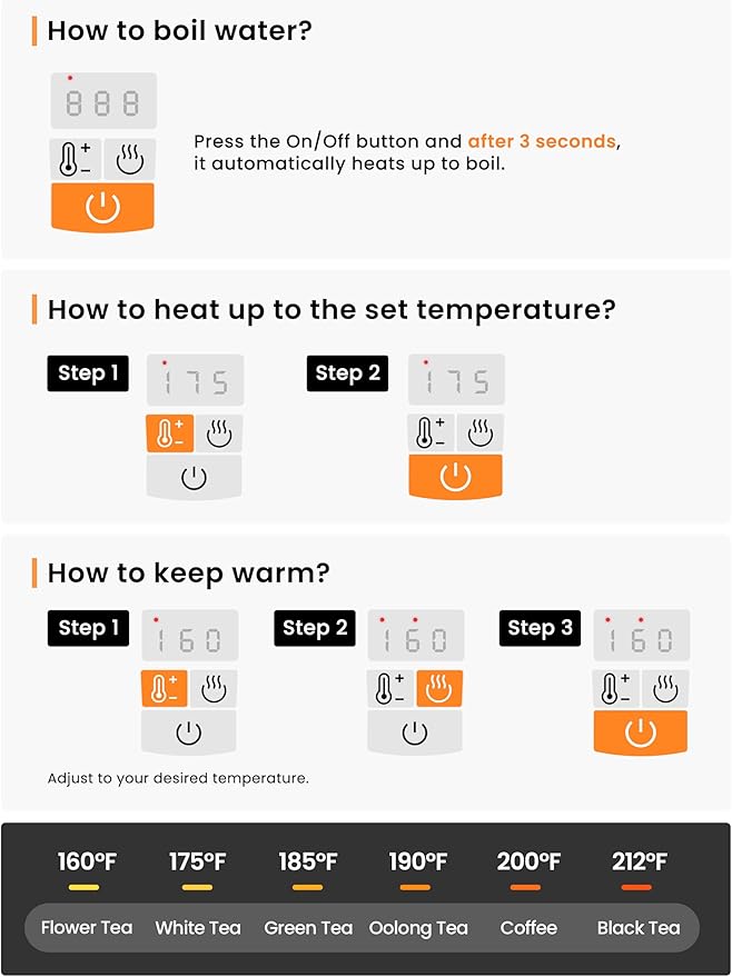 - Nicely Equipped - This portable kettle comes with LED lights and an advanced thermostat that ensures precise water temperature control within ±5°F. Fast Boiling lets you heat water in 3-7 minutes while Keep Warm keeps it warm up to 2-hours. Ideal for hot chocolate, pour-over coffee, and other hot beverages.