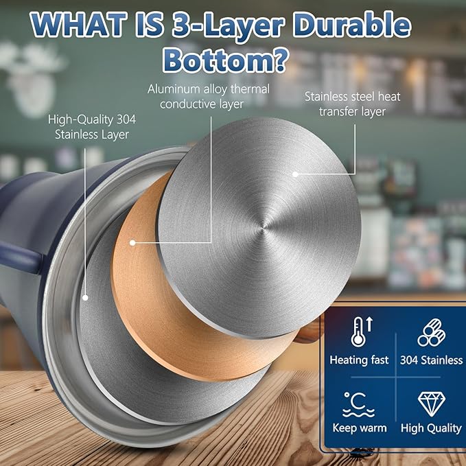 - Three layer base enhances heat retention and durability: Professional grade 18/8 stainless steel construction with triple layer base prevents rust and leaks; Uniform heat circulation ensures rapid boiling on gas, induction or electric stoves; Medium heat setting below 1400W recommended for induction compatibility