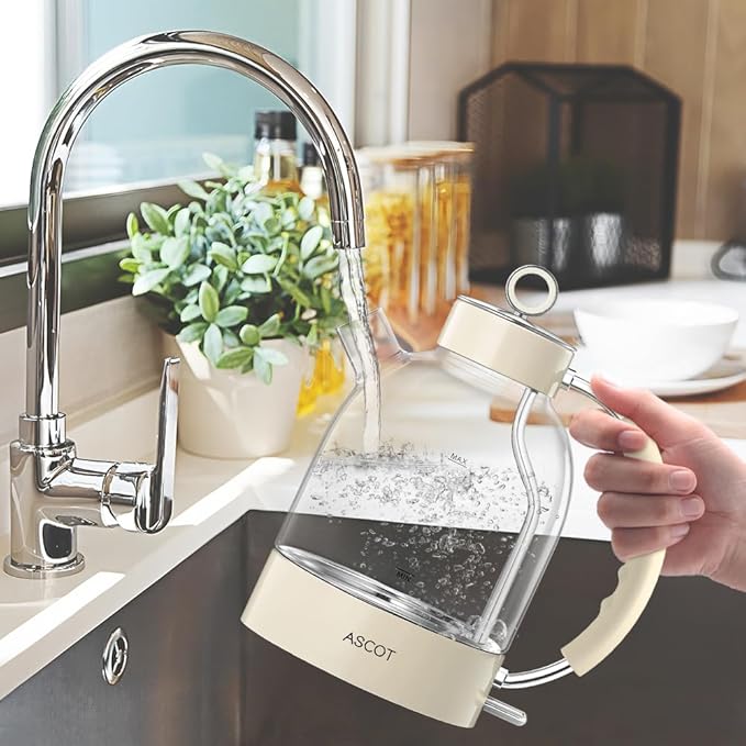 ASCOT Electric Kettle, Glass Electric Tea Kettle Gifts for Men/Women/Family 1.5L 1500W Borosilicate Glass Tea Heater, with Auto Shut-Off and Boil-Dry Protection (Beige)