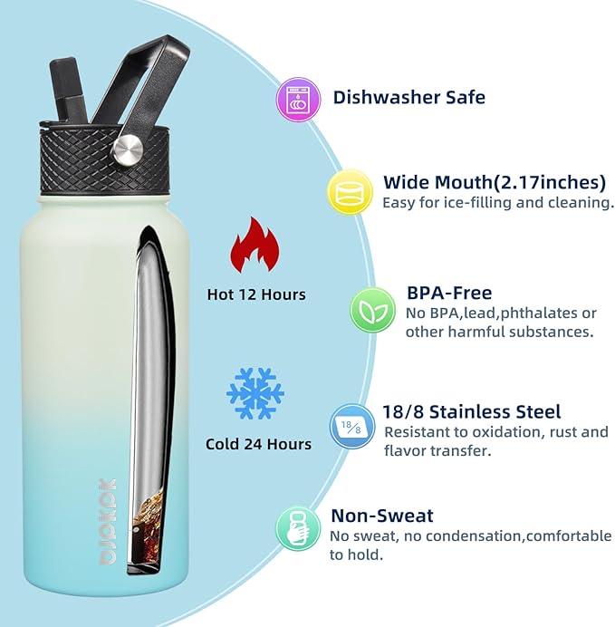 - 2 PACK INSULATED WATER BOTTLE: BJPKPK insulated water bottles with straw lids use double-walled vacuum insulation technology to keep your beverage cold for up to 24 hours, or hot for up to 12 hours, make sure you enjoy your favorite beverages at the most suitable temperature all day