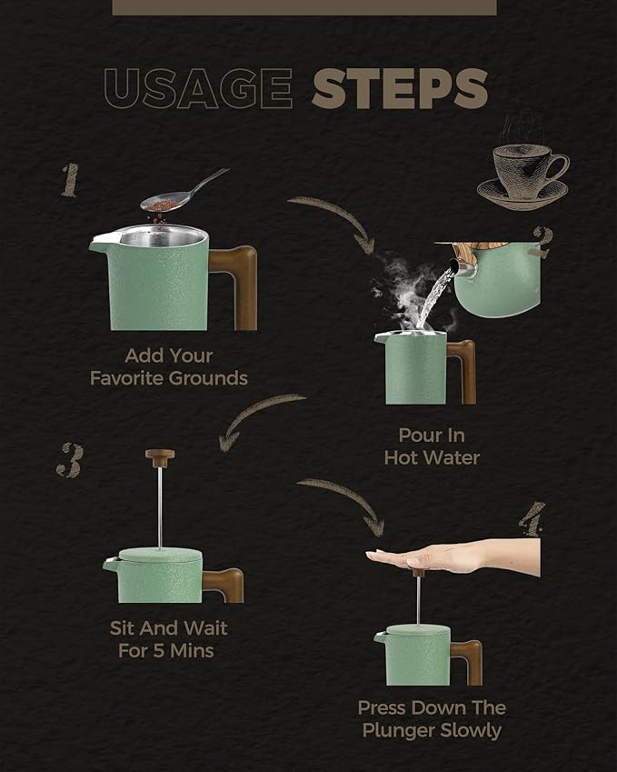 - LOOKING FOR COFFEE PRESS FOR MATCHING UP YOUR KITCHEN? We, the POLIVIAR french press coffee maker will be your smart choice. While the coffee pot is made from food grade stainless steel with stylish long-lasting coating, It is easily to match up your kitchenwares and your kitchen's theme. Also, the ergonomic handle with real wood will maximize the fantastic time of grounds you loved.