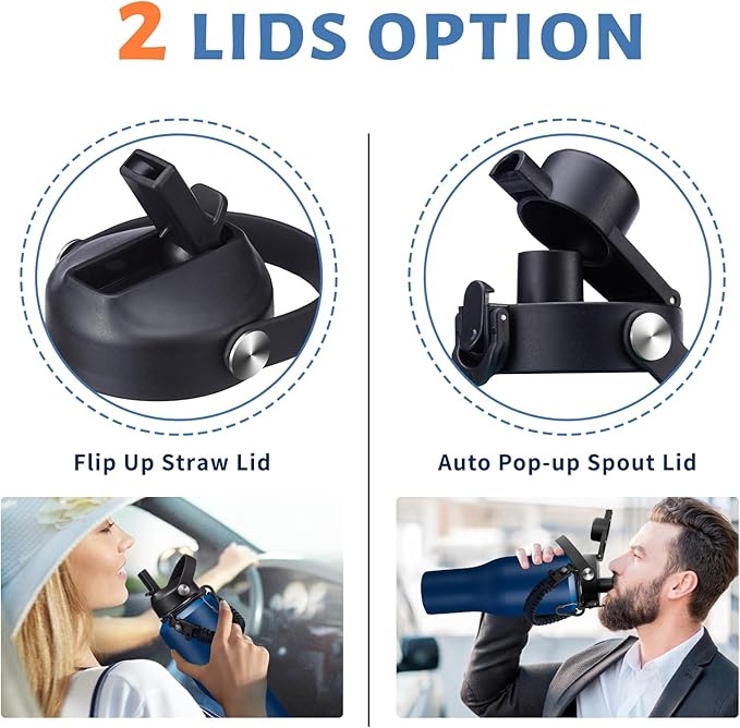 - LEAK-PROOF STRAW LID & AUTO SPOUT LID: This stainless steel water bottles with straw lid and chug lid, both BPA-free, leak-proof and one-hand conctorl design, great car must have things!