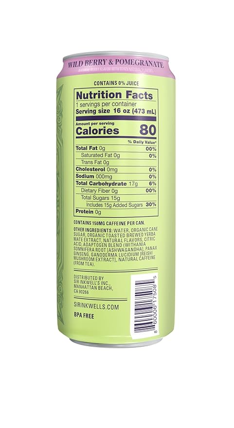 SIR INKWELL’S Adaptogen Yerba Mate Tea | Healthful Energy + Productivity 150 mg Organic Caffeine | 300mg Ashwagandha Reishi Ginseng |Non-GMO Certified | Wild Berry & Pomegranate 16oz 12pk