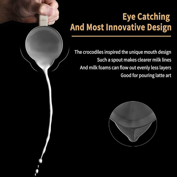 - Crocodile Spout and a Double Diversion Trench: The milk is released in plenty and making the second period of oscillation simpler by the front and back double-arced diversion trench of the frothing pitcher spout. The swing lines are more distinct thanks to the unique crocodile spout design, and you may create more pattern you like.