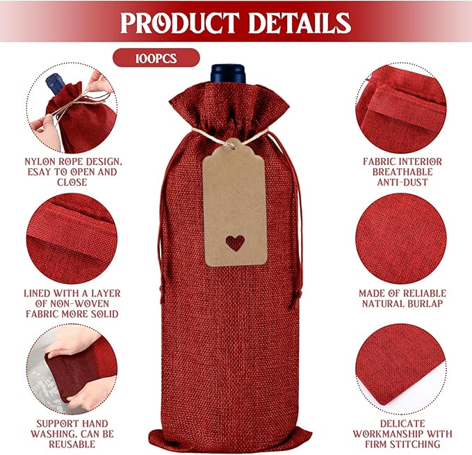 - Package Includes: you will get 100 pack burlap bag for wine bottle with the drawstrings and heart rectangular tags, enough styles and quantity to satisfy your use and sharing, a nice combination for your wine decoration
