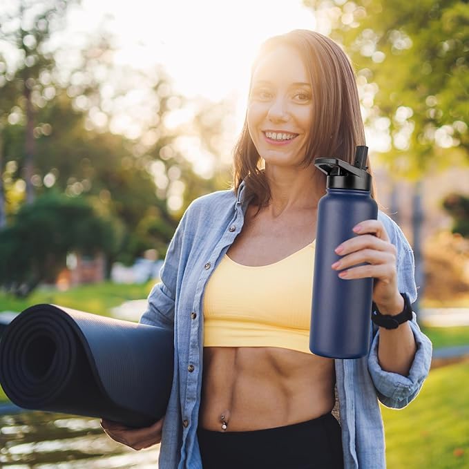 DOMICARE 40 oz Insulated Water Bottle Bulk, Vacuum Insulated Stainless Steel Sports Water Bottle with Straw Lid & Spout Lid, Leakproof, Reusable - Travel, Camping, Bike, Navy Blue (4 Pack)
