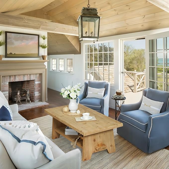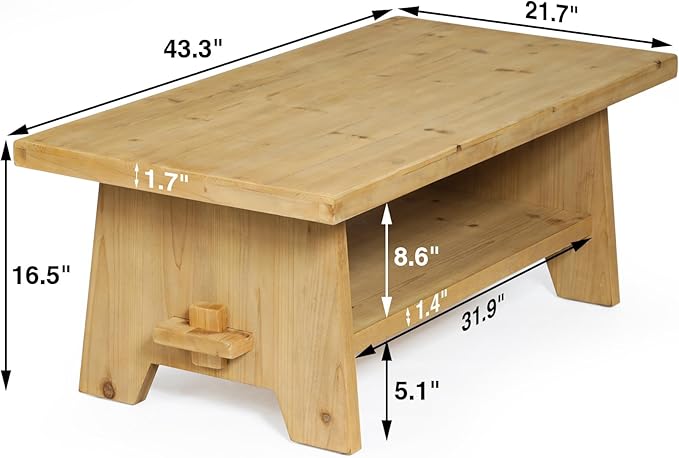 Farmhouse Wood Coffee Table - 43.4” Mid Century Modern Wooden Coffee Tables for Living Room, Solid Firwood Tabletop Rectangle Coffee Table, Center Table for Living Room, Natural Wood Color