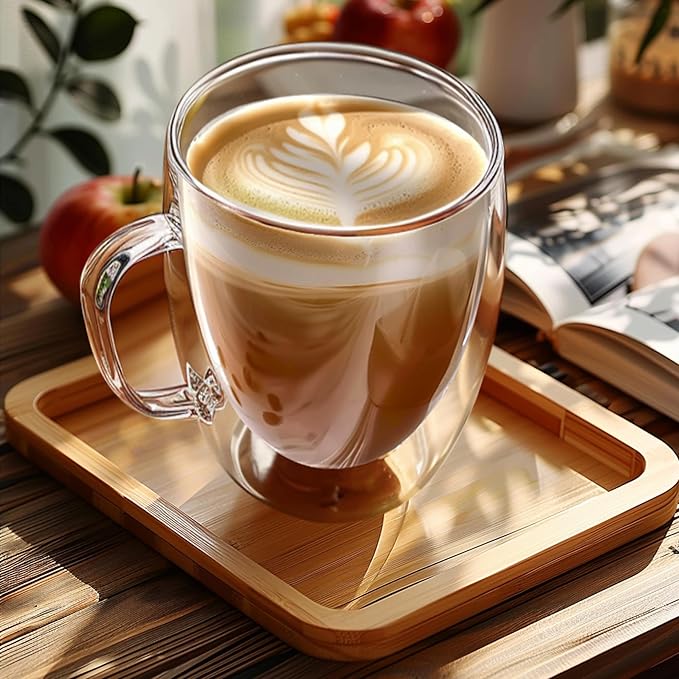 - 【HIGH END GLASS】- Double walled glass coffee cups are made of borosilicate glass, so the cups are very light to hold in the hand. You can listen to their crisp sound by hitting.The body of the cup is crystal clear and translucent, and the mouth of the cup is smooth.