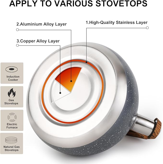 - ✅【Apply to Various Stovetops】Applicable for all kinds of stove top such as induction cooker, electric furnace, gas and natural gas stovetops. please use a low or medium fire to heat the kettle to prevent the flame from burning the outer coating directly.