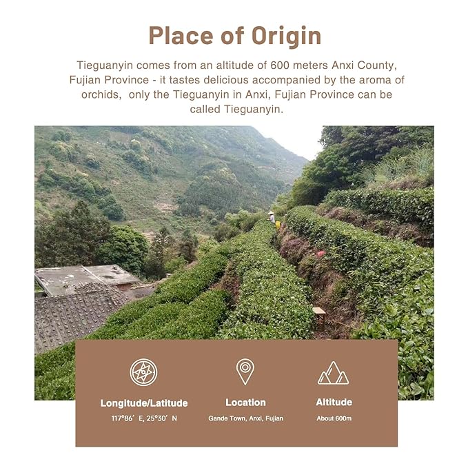 - Alpine Tea Garden: Our Oolong tea comes from authentic Tieguanyin from Anxi, Fujian, the origin of oolong tea. Alpine Tea Garden, 117°86'E to the east, 25°30° north latitude, altitude: 600 meters