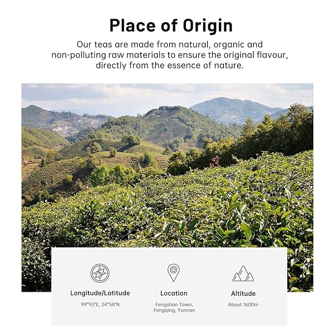 - Sourced from High-Altitude Tea Gardens: Our teas are grown in picturesque 1600-meter alpine tea plantations in Fengqing County, Yunnan Province, China, the tea leaves are tender benefited from excellent soil and nourishing alpine mists