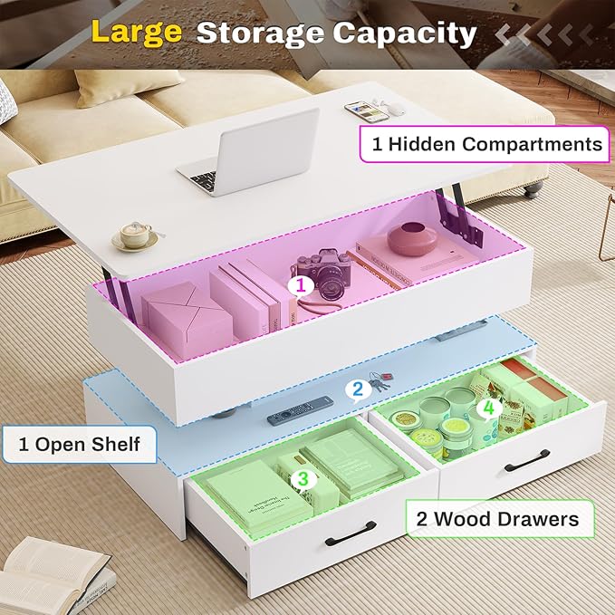 - 【What you get?】The lift top coffee table with 2 using methods also has hidden storage compartment, an open storage shelf, 2 drawers and LED light. Coffee tables for living room can be used when eating, working, studying and playing games, quietly and easily lift the table top to facilitate small room to make full use of the space.