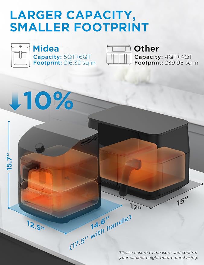 Midea Dual Basket Air Fryer Oven 11 Quart 8 in 1 Functions, Clear Window, Smart Sync Finish, Works with Alexa, Wi-Fi Connectivity, 50+ App Recipes for family meals, Bake, Roast, Grill, Broil, Toast