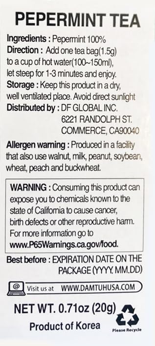 Damtuh Peppermint Tea – 100% Pure Peppermint, Caffeine-Free Herbal Tea, 10 Tea Bags (1g each)