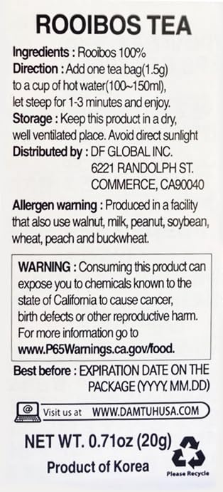 Damtuh Rooibos Tea – 100% Pure Rooibos, Caffeine-Free Herbal Tea, 10 Tea Bags (1g each)